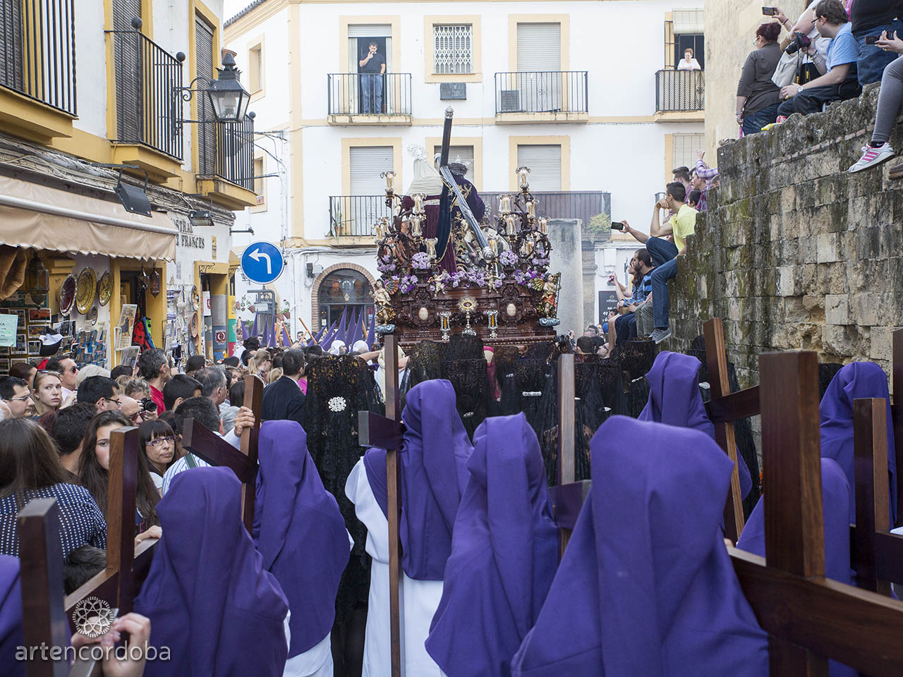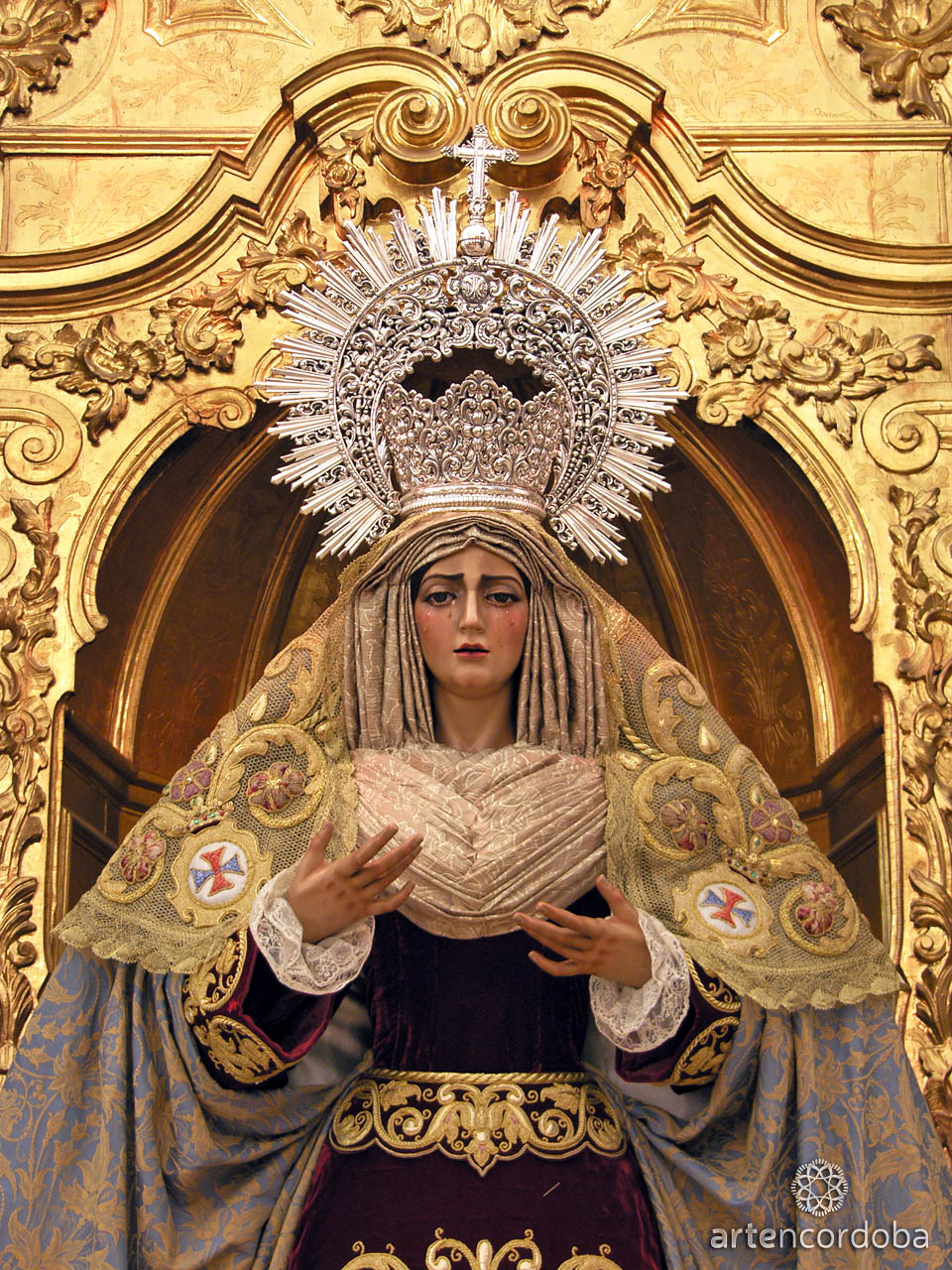 La procesión se completa con María Santísima de la Trinidad, dolorosa de serena belleza y fuerte vínculo emocional con el barrio, que aporta equilibrio y profundidad espiritual al conjunto. La hermandad es especialmente reconocida por su taller de bordado propio, su cuidado patrimonial y una de las medias de edad más jóvenes entre las cofradías cordobesas, lo que le confiere un estilo dinámico y contemporáneo sin perder rigor tradicional.