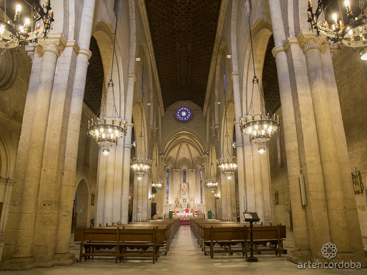 Interior: tres naves separadas por pilares con artesonados mudéjares de lacería, tres ábsides y capillas destacadas como la de la Virgen del Rosario, ejemplo del barroco cordobés (1758).