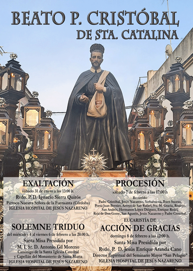 La procesión del Beato Padre Cristóbal de Santa Catalina en Córdoba, organizada por la Congregación de Hermanas Hospitalarias de Jesús Nazareno Franciscanas y la Hermandad del Nazareno, celebra la figura del fundador, fundador del Hospital Jesús Nazareno.